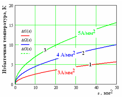 Расчетные значения температуры поверхности проводника в зависимости от плотности тока и сечения обмотки приведены на рис.2.